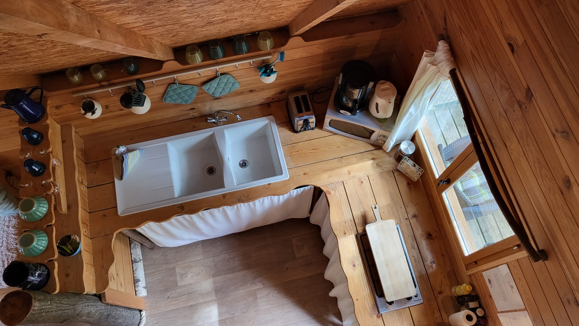 Le nécessaire pour réaliser des boissons chaudes est dans la cabane. A votre arrivée nous vous demandons ce que vous souhaitez pour le petit déjeuner (jus d’orange, beurre, confiture, fruit, yaourt, thé, café, chocolat, croissant, pain…) livraison le matin vers 9h00.