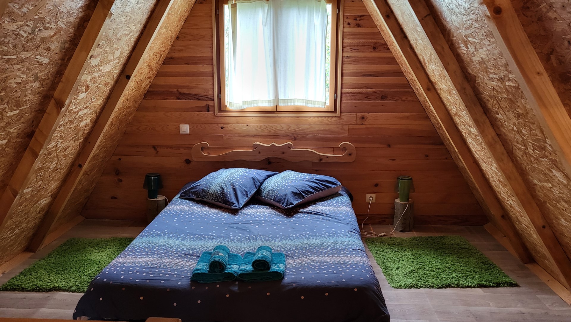 La chambre située en mezzanine offre un point de vue sur la nature environnante. La terrasse vous invite à paresser en fin de soirée, et à écouter les bruits de la nature.