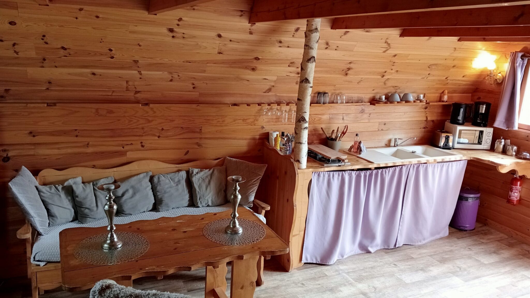 Le nécessaire pour réaliser des boissons chaudes est dans la cabane. A votre arrivée nous vous demandons ce que vous souhaitez pour le petit déjeuner (jus d’orange, beurre, confiture, fruit, yaourt, thé, café, chocolat, croissant, pain…) livraison le matin vers 9h00.