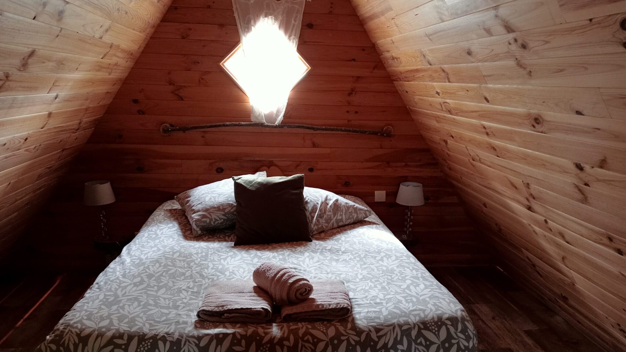 La chambre située en mezzanine offre un point de vue sur la nature environnante. La terrasse vous invite à paresser en fin de soirée, et à écouter les bruits de la nature.